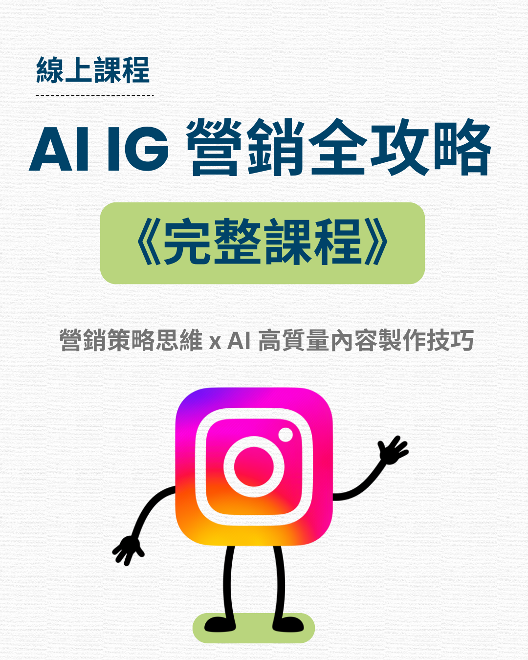 《AI IG 營銷全攻略線上課程》整合 策略思維篇 及 內容策劃及製作篇,全面涵蓋由基礎營銷邏輯到實際用 AI 製作內容技巧,協助學員由「不知道如何開始」,進階至「能穩定產出並有效經營 IG 帳號」。 課程將帶領你先建立正確的 Instagram 營銷策略,了解平台運作與帳號定位,再進一步學習如何運用 AI 工具進行內容構思、文案撰寫及視覺製作,將想法快速轉化為具曝光與互動潛力的內容。 透過完整學習流程,你將掌握: ✅ 訂制合適你的 IG 營銷策略 ✅ 建立清晰帳號定位與內容方向 ✅ 運用 AI 高效策劃與製作 IG 內容 ✅ 節省內容製作心力時間,快速獲取生意 無論你是中小企老闆、一人公司、自媒體創作者,或希望提升社交媒體營銷效率的初學者,本課程將協助你建立一套可長期運作的 AI IG 營銷方法。
